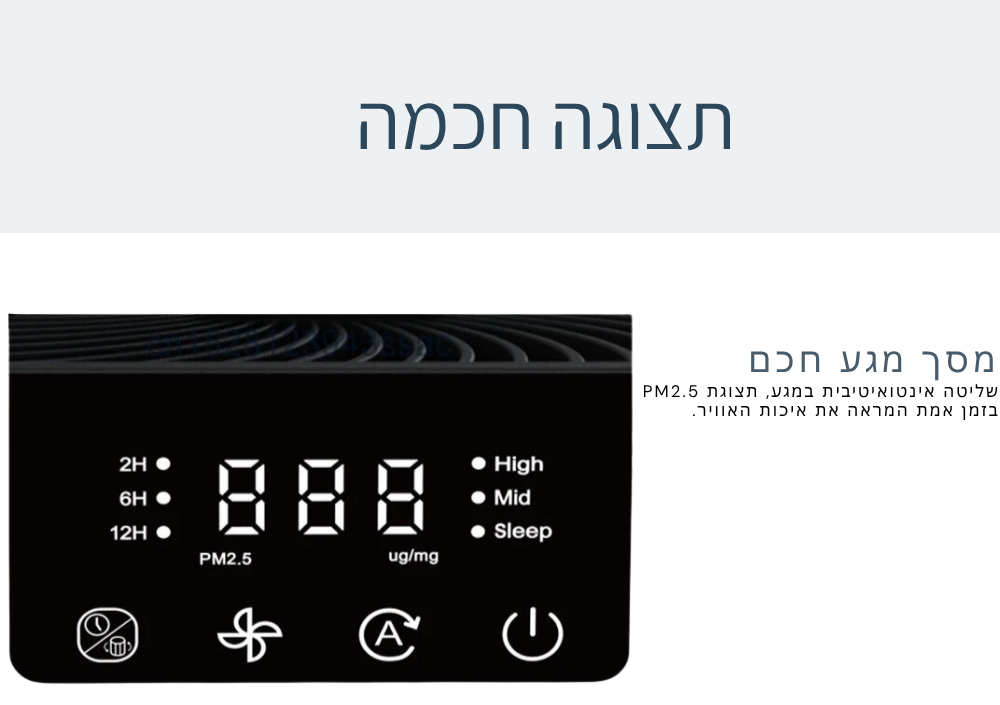 כן. תצוגת ה-PM2.5 הדיגיטלית המובנית מעניקה לך מידע בזמן אמת על איכות האוויר בבית, כך שתדעו תמיד בדיוק מה אתם נושמים.